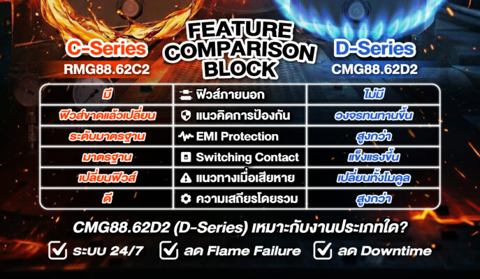 การอัปเกรดจาก RMG88.62C2 (C-Series) ไปเป็น CMG88.62D2 (D-Series) จึงไม่ใช่แค่เปลี่ยนรุ่นสินค้า แต่คือการยกระดับมาตรฐานของระบบควบคุมหัวเผาให้รองรับงานอุตสาหกรรมที่ต้องการความต่อเนื่องสูง เช่น ระบบ 24/7