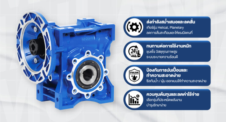 - ควรเลือก: ชิ้นส่วนที่ผ่านการชุบแข็ง วัสดุคุณภาพสูง แบริ่งทนทาน และระบบระบายความร้อนดี พร้อม Service Factor ที่เหมาะสม