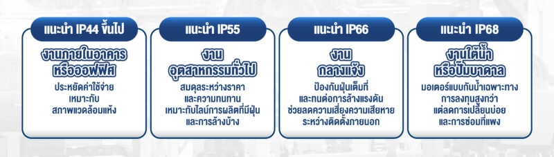 การระบุรหัส IP อย่างชัดเจน บนหน้าสินค้าและในสื่อการตลาด ไม่เพียงช่วยลูกค้าเลือกมอเตอร์ที่เหมาะสม แต่ยังเป็นเครื่องมือสร้างความเชื่อมั่น ลดการคืนสินค้า และเปิดโอกาสในการขายบริการเสริม เช่น การติดตั้งและแผนบำรุงรักษา แนะนำให้ใส่ตารางสรุป IP และภาพประกอบในหน้าโปรดักต์เพื่อเพิ่ม Conversion