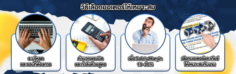 - พิจารณาลักษณะโหลด: โหลดคงที่ โหลดเปลี่ยนแปลง หรือโหลดที่มี Impulse/Shock ต้องเลือกมอเตอร์และเกียร์ที่ออกแบบรองรับ
